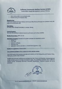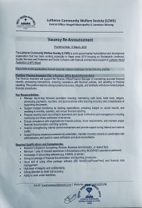 Notice of Vacancy Re-announcment for the Position of Finance Assistant (FA) at LCWS. Leave a Comment / Notices / By LCWS Nepal
